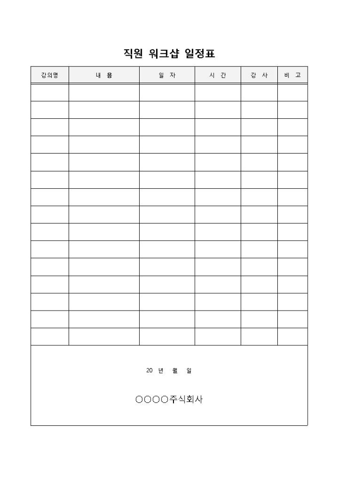 9,000원/월직원워크샵 일정표 입니다. 구분, 일자, 시간, 강의명, 강사 등으로 구성되었습니다. 각 강의별 운영사항 작성 및 일정관리에 용이합니다.