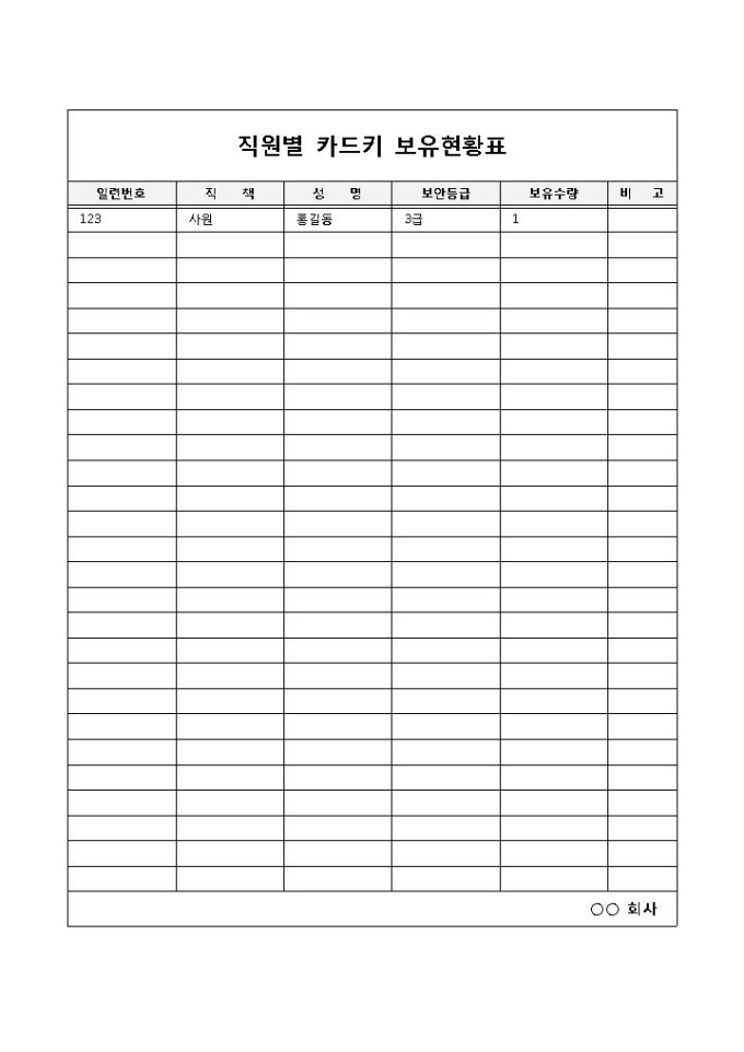 회사 내에서 직원별로 보안등급에 따른 카드키의 보유현황을 표로 기록하고 관리할 때 사용되는 직원별 카드키 보유현황표 양식입니다. 일련번호, 직책, 성명, 보안등급, 보유수량, 비고의 항목으로 구성되어 있습니다.