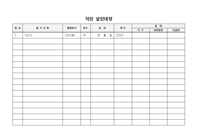 9,000원/월해당 문서에 대한 직인 날인의 관리 및 기록을 위해 사용되는 직인 날인대장 양식입니다. 문서건명, 발행부처, 부수, 일자, 계인, 결재 등의 항목으로 구성되어 있습니다.
