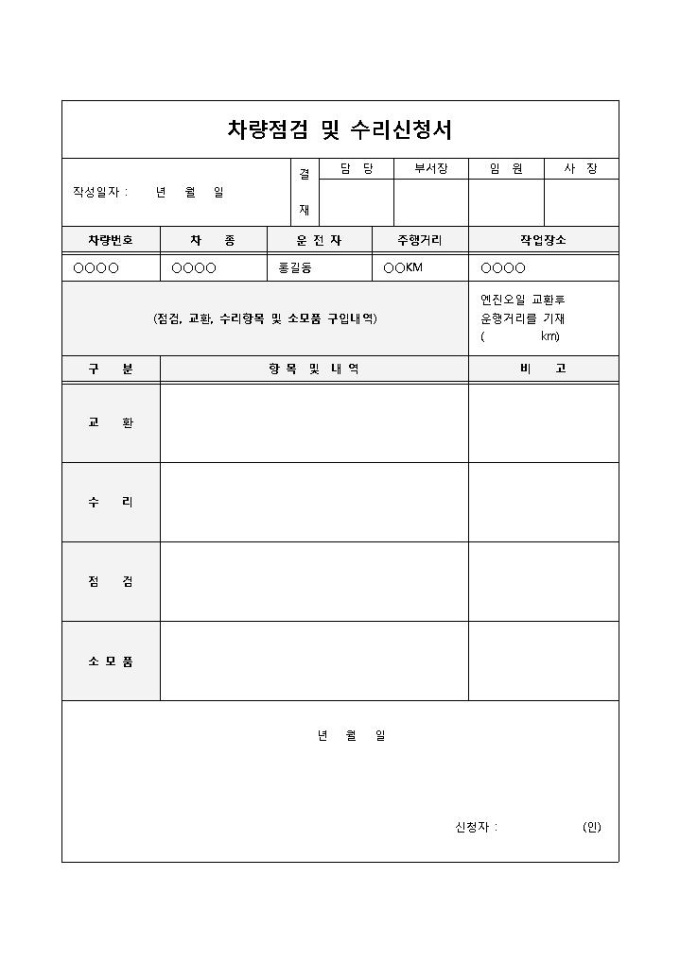 차량을 점검하거나 수리가 필요할 때 항목이나 내역을 기록하여 신청할 때 사용되는 차량점검 및 수리신청서 양식입니다. 차량번호, 차종, 운전자, 주행거리, 작업장소, 항목 및 내역 등의 항목으로 구성되어 있습니다.