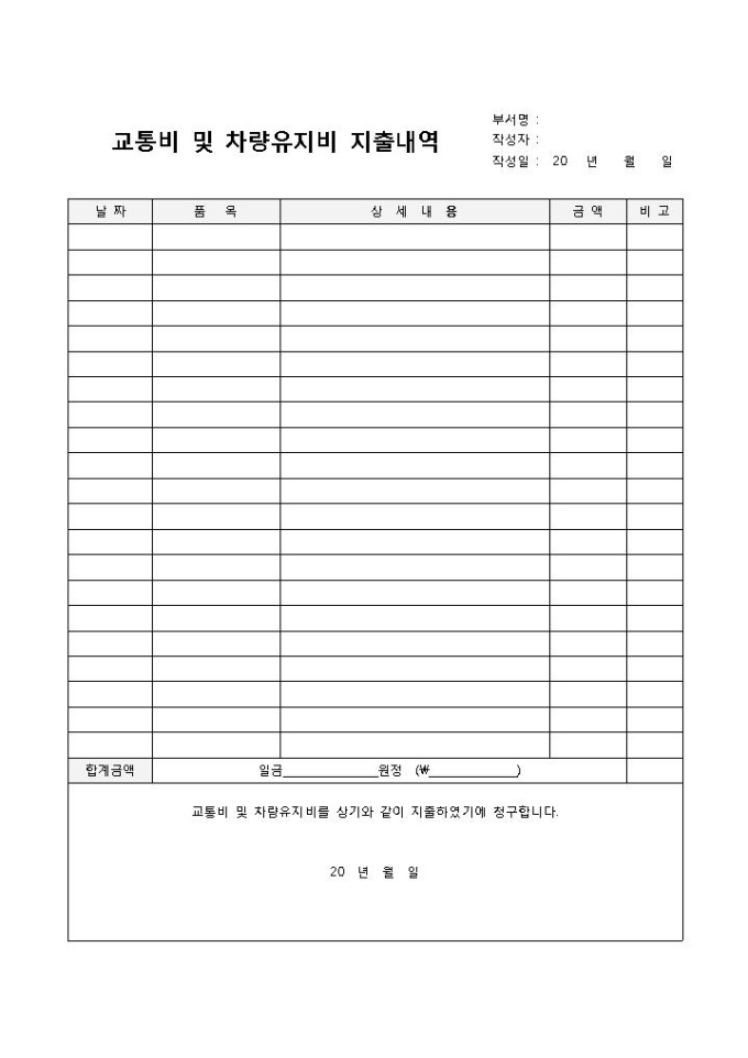 9,000원/월차량유지비(교통비 및 차량유지비 지출내역)입니다. 날짜, 품목, 상세내용, 금액 등의 항목으로 구성되어 있습니다. 교통비와 차량유지비 내역을 함께 기록하여 관리 할 수 있는 양식입니다.