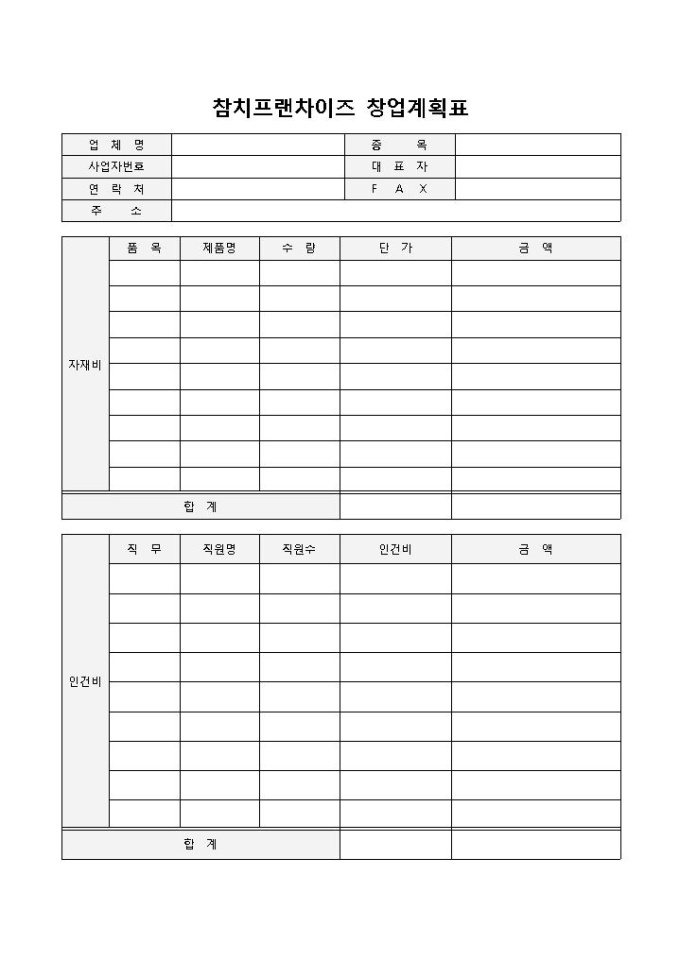 9,000원/월참치프랜차이즈 창업계획표 입니다. 업체명, 사업자번호, 연락처, 종목, 대표자, FAX, 주소 등으로 구성되었습니다. 자재비 및 인건비를 작성하고 그에 따른 예상창업액 파악에 용이합니다.
