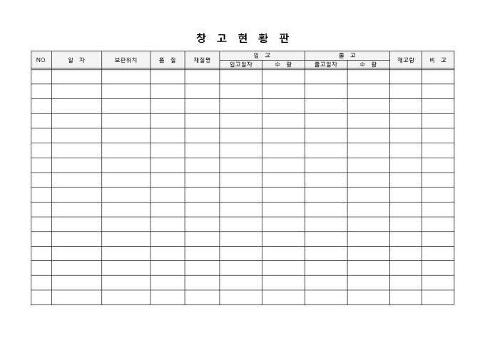 9,000원/월창고현황판 입니다. 업체명, 보관위치, 품질, 재질명, 입고, 출고 등으로 구성되었습니다. 날짜별 제품 수량 파악 및 잔여수량 계산에 효과적입니다.