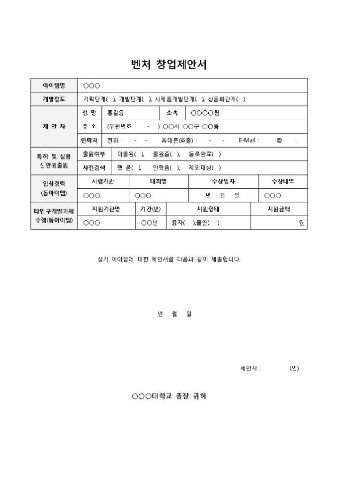 벤처 창업 시 내용과 같이 아이템에 대한 제안서를 제출할 때 사용되는 벤처 창업제안서 양식입니다. 아이템명, 개발정도, 제안자, 입상경력 등의 항목으로 구성되어 있습니다.