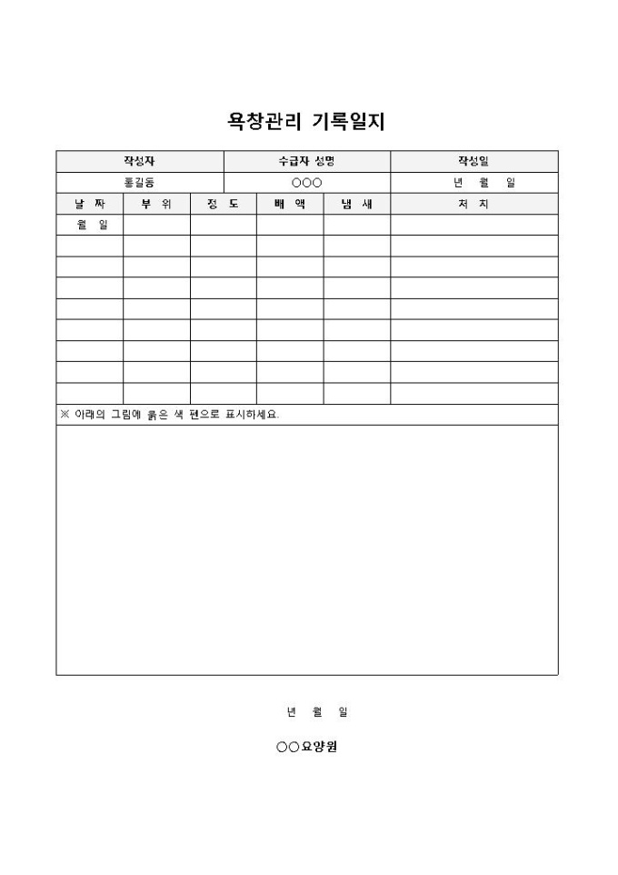 부위, 정도, 배액, 냄새, 처치의 항목으로 구성되어 욕창의 관리를 기록할 때 사용되는 욕창 관리 기록일지 양식입니다. 요양기관 등에서 쓰입니다.