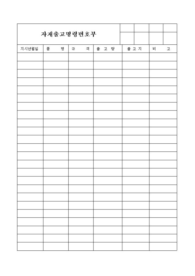 9,000원/월자재출고명령번호부 양식입니다. 출고일별 품명, 규격, 출고량, 출고지등으로 구성된 양식입니다.