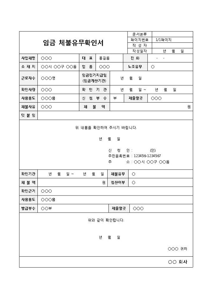 9,000원/월사용자로부터 받지 못한 임금의 유무와 구체적인 내역을 확인할 때 사용되는 임금 체불유무 확인서 양식입니다. 사업체명, 임금정기지급일, 확인기간, 체불사유, 체불액 등의 항목으로 구성되어 있습니다.