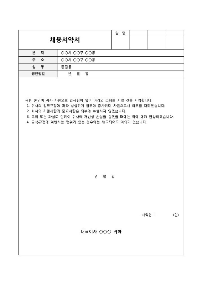 정규직에 해당되는 채용에 대한 서약 내용을 반드시 지키겠다는 내용의 채용서약서(정규직) 양식입니다. 본적, 주소, 성명, 생년월일, 서약내용, 일자 등의 항목으로 구성되어 있습니다.