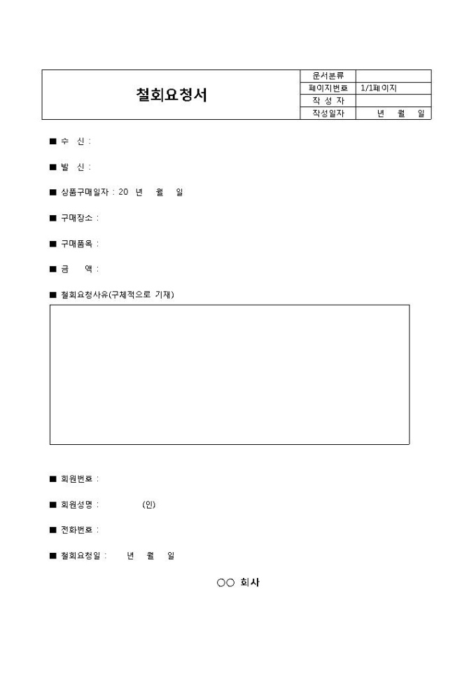 9,000원/월상대방에게 계약의 철회를 요청하기 위한 목적으로 작성할 때 사용되는 철회요청서 양식입니다. 수신, 발신, 상품구매일, 구매장소, 구매품목, 금액, 철회요청사유 등의 항목으로 구성되어 있습니다.
