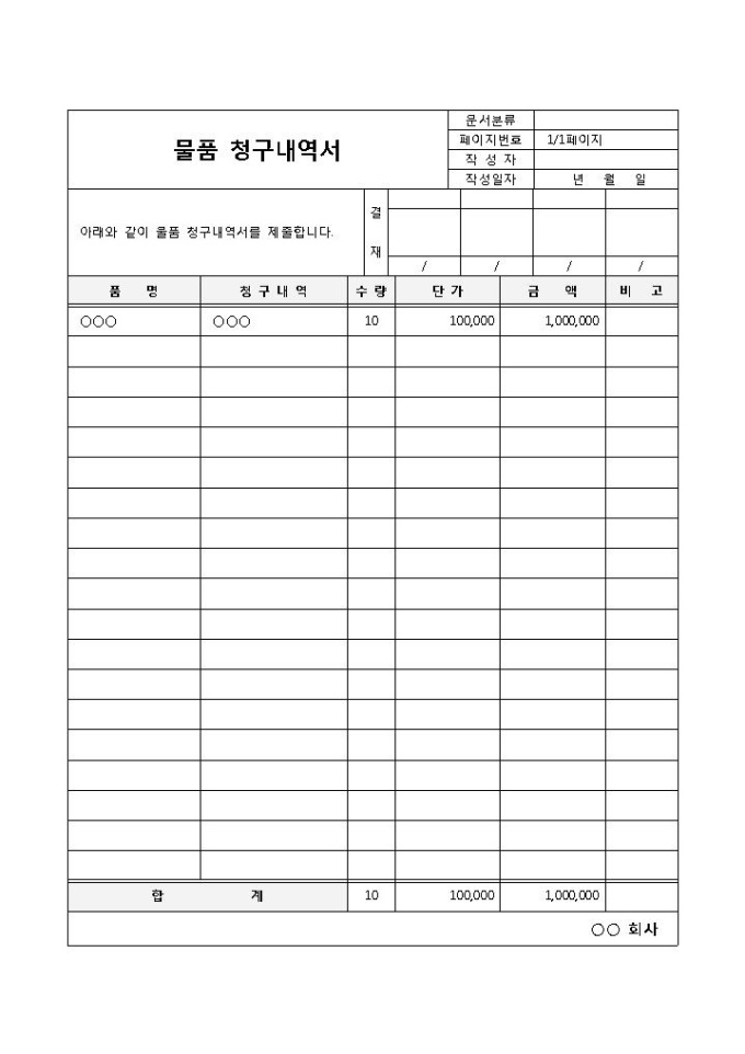 9,000원/월상대방에게 물품의 대금을 청구하기 위하여 그 내역을 상세히 기록할 때 사용되는 물품 청구내역서 양식입니다. 품명, 청구내역, 수량, 단가, 금액, 합계 등의 항목으로 구성되어 있습니다.