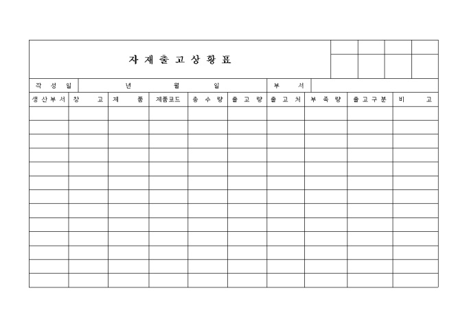 자재출고상황표 양식입니다. 부서별 제품의 총수량, 출고량, 출고처, 부족량, 출고구분등의 항목으로 구성된 상황표 양식입니다.