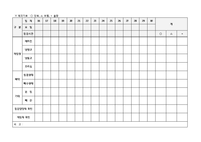 9,000원/월청소를 한 후에 환경상태를 점검하기 위해 사용되는 청소상태점검표 양식입니다. 일자, 요일, 점검시간, 구분, 계 등의 항목으로 구성되어 있습니다.