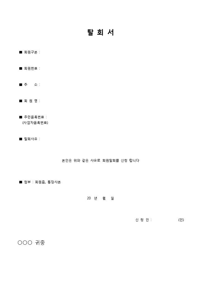 9,000원/월탈회서입니다. 인적사항, 탈회사유, 첨부 등으로 구성되어 있습니다. 모임으로부터 탈회를 원할 때 사용할수 있습니다.