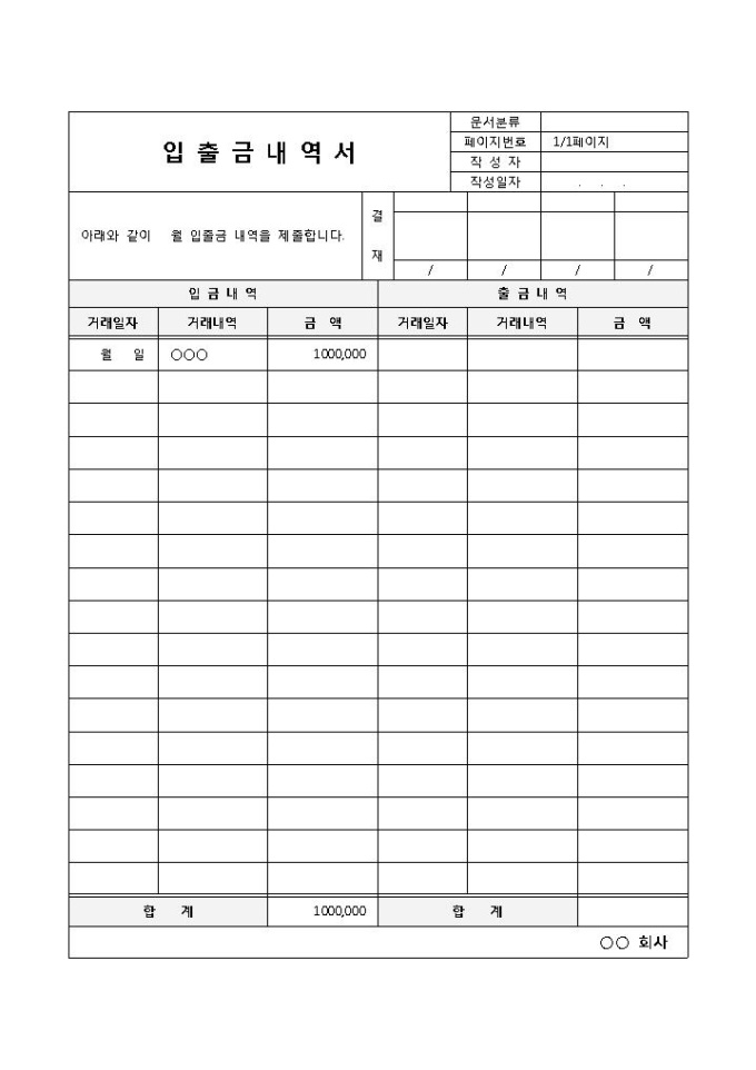 입, 출금의 내역을 거래일자, 내역, 금액으로 구분하여 작성된 입출금 내역서 양식입니다. 입금내역, 출금내역, 거래일자, 거래내역, 금액 등의 항목으로 구성되어 있습니다.