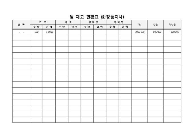 월간 재고의 현황을 수량 및 금액, 수금, 미수금으로 분류해서 작성한 화장품 지사에서 사용되는 월 재고 현황표 양식입니다. 날짜, 기초, 색조 화장품의 수량, 금액, 계 등으로 구성되어 있습니다.