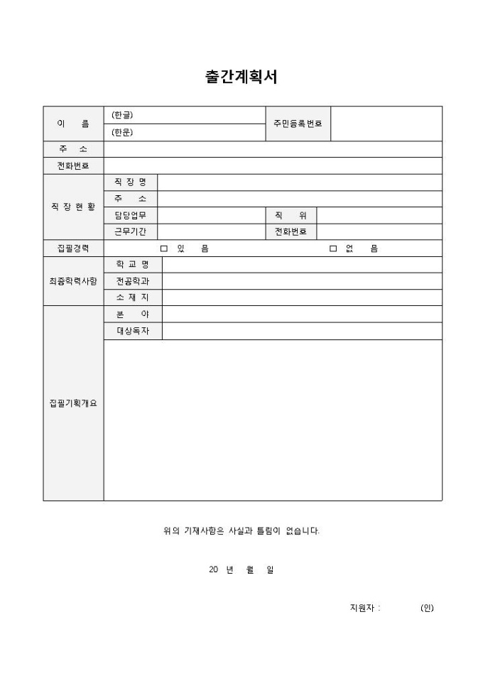 출간계획서입니다. 인적사항, 직장현황, 집필경력, 최종학력사항, 집필기획개요 등의 항목으로 구성되어 있습니다. 기본적인 출간계획서로 출간계획에 대해 간략하게 쓸 수 있는 양식입니다.