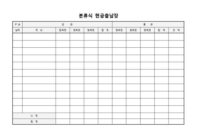 9,000원/월분류식 현금출납장입니다. 구분, 입금, 출금, 날짜, 적요, 항목명, 합계 등으로 구성되어 있습니다. 기업이나 단체, 개인에서 분류식으로 현금에 대한 출납장으로 작성하여 사용할 수 있습니다.
