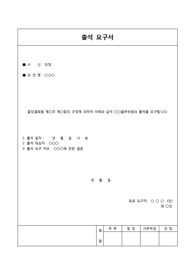 의회에서 특정 사안으로 인해 출석할 것을 요구할 때 사용되는 출석 요구서(의회) 양식입니다. 수신, 의안명, 출석 일자, 출석 대상자, 이유 등의 항목으로 구성되어 있습니다.