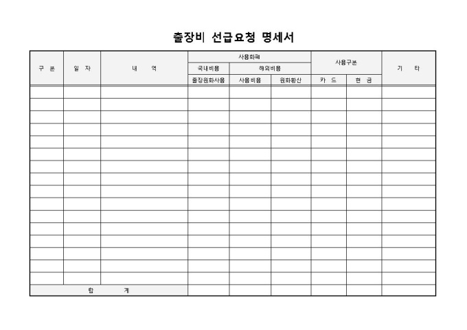출장비 선급요청 명세서입니다. 구분, 일자, 내역, 사용화폐, 국내비용, 해외비용, 출장원화사용, 사용비용, 원화환산, 사용구분 등으로 구성되어 있습니다. 기업에서 출장비에 대한 선급요청과 명세서로 작성하여 사용할 수 있습니다.