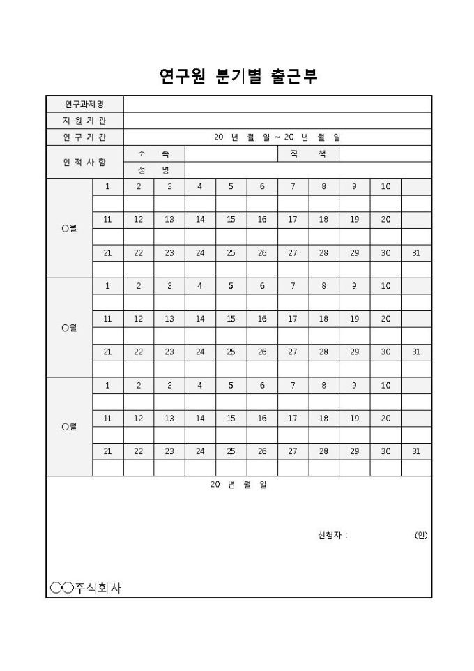 9,000원/월연구원 분기별 출근부입니다. 연구과제명, 지원기관, 연구기간, 연구원 인적사항, 매월 등으로 구성되어 있습니다. 연구소에서 연구원의 분기별 출근기록부로 작성하여 사용할 수 있습니다.