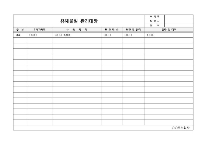 유해물질의 사용목적이나 보관장소, 보관이나 관리, 대책 등의 항목을 고려하여 작성한 유해물질 관리대장 양식입니다. 구분, 유해자재명, 영향 및 대책 등의 항목으로 구성되어 있습니다.