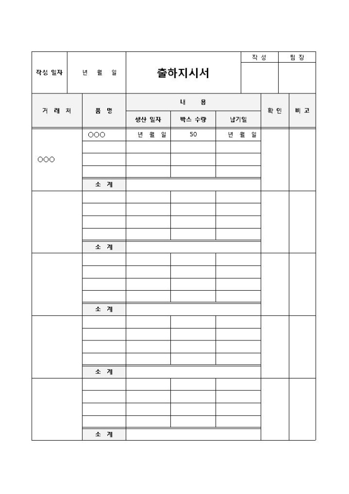 9,000원/월제품 출하가 필요하다고 판단할 때, 이를 지시하기 위해 사용되는 출하지시서(거래처별) 양식입니다. 거래처, 품명, 생산일자, 박스수량, 납기일, 소계, 확인 등의 항목으로 구성되어 있습니다.