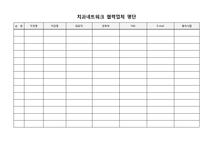 치과네트워크 협력업체 명단 입니다. 지역명, 치과명, 대표자, 연락처 등으로 구성되었습니다. 협력업체의 연락사항 및 특이사항 기입에 용이합니다.