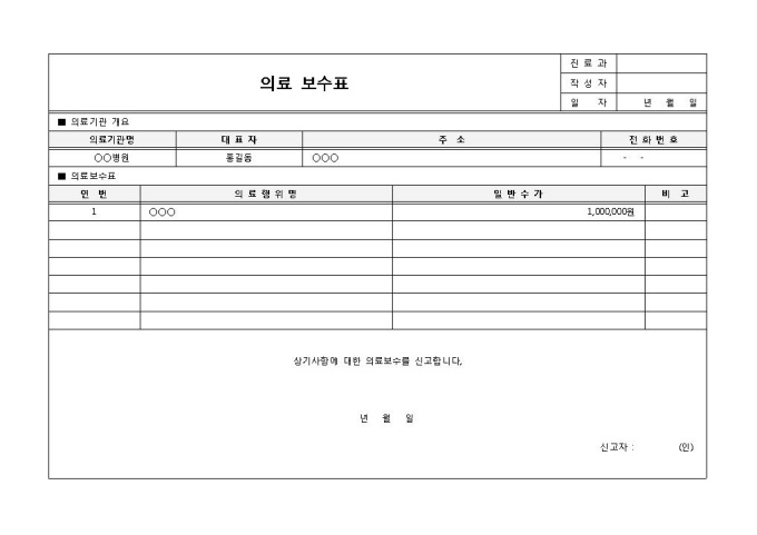 9,000원/월의료행위에 대해 의료보수를 신고할 때 기록 및 제출로 사용되는 의료 보수표 양식입니다. 의료기관의 개요, 의료행위명, 일반수가 등의 항목으로 구성되어 있습니다.