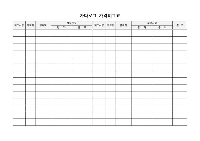 9,000원/월카타로그 가격비교표 입니다. 제조사명, 대표자, 연락처, 세부사항 등으로 구성되었습니다. 업체별 카다로그 가격을 기재하고 비교 분석할 수 있습니다.