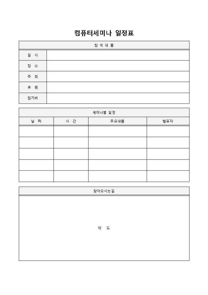 컴퓨터세미나 일정표 입니다. 참석내용, 일시, 장소, 주최, 후원, 참가비 등으로 구성되었습니다. 세미나별 일정 구성 및 약도 첨부에 용이합니다.