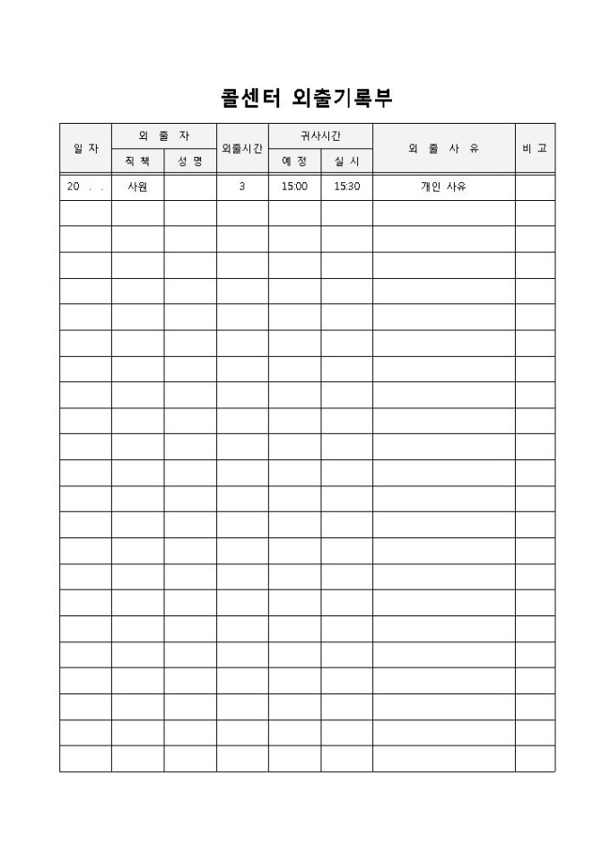 콜센터 외출기록부입니다. 일자, 외출자, 외출시간, 귀사시간, 외출사유, 비고로 구성되어 있습니다. 콜센터회사에서 직원들의 외출 기록부로 작성하여 사용할 수 있습니다.
