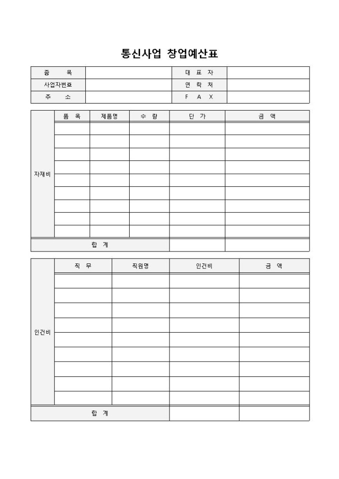 9,000원/월통신사업 창업예산표 입니다. 품목, 제품명, 수량, 단가, 금액 등으로 구성되었습니다. 자재비 및 인건비를 통해 창업에 소요되는 최소자본을 계산하는데 효과적입니다.