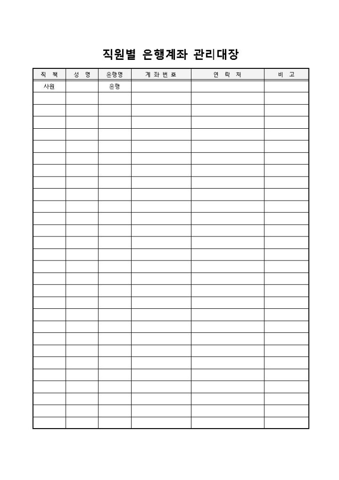 직원별 은행계좌 관리대장입니다. 직책, 성명, 은행명, 계좌번호, 연락처, 비고로 구성되어 있습니다. 은행의 직원별로 직원 계좌의 관리대장으로 작성하여 사용할 수 있습니다.