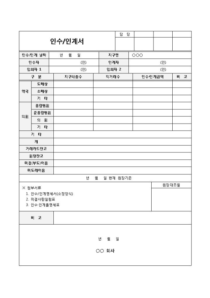 인수자, 인계자, 입회자 간의 인수, 인계를 위해 사용되는 인수, 인계서 양식입니다. 인수, 인계날짜, 지구명, 인수자, 인계자, 입회자 성명, 지구내총수, 직거래수, 금액 등의 항목으로 구성되어 있습니다.