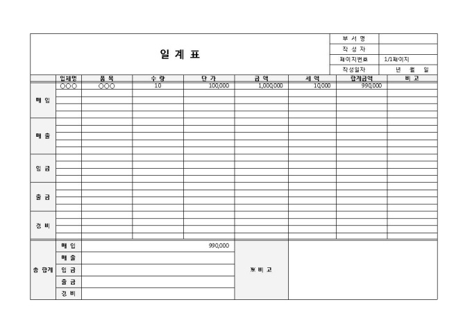 매입과 매출, 입금, 출금, 경비를 통계하고 기록할 때 사용되는 일계표 양식입니다. 업체명, 품목, 수량, 단가, 금액, 세액, 합계 등의 항목으로 구성되어 있습니다.