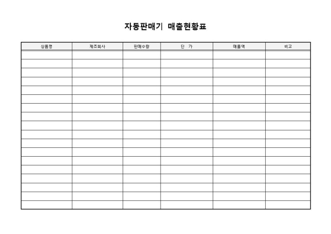 자동판매기 매출현황표입니다. 상품명, 제조회사, 판매수량, 단가, 매출액, 비고로 구성되어 있습니다. 기업에서 자동판매기에 대한 매출 현황표를 작성하여 사용할 수 있습니다.