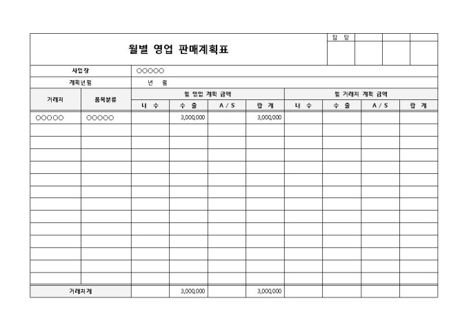 월별 영업 제품의 판매 실적을 관리하기 위한 목적으로 사용되는 월별 영업 판매계획표 양식입니다. 사업장, 계획년월, 거래처, 품목분류, 월 영업 계획 금액, 월 거래처 계획 금액, 거래처 계 등의 항목으로 구성되어 있습니다.