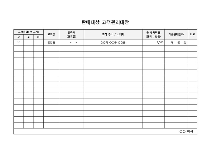 판매대상 고객의 주문 내역을 알기 쉽게 표로 만든 판매대상 고객관리대장 양식입니다. 고객등급, 고객명, 연락처, 고객 주소, 총 구매비용, 최근 판매일자 등의 항목으로 구성되어 있습니다.