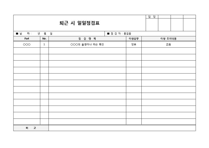 9,000원/월퇴근 시 점검이 필요한 항목들의 점검을 함과 동시에 이상유무의 기록 및 조치를 취하기 위해서 사용되는 퇴근 일일점검표 양식입니다. 날짜, 점검자, 점검항목, 이상유무, 조치내용 등의 항목으로 구성되어 있습니다.