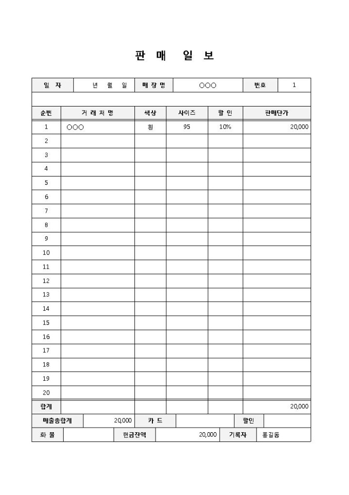 일일 판매시간 내의 판매실적현황을 일자별로 기록하고 관리할 때 사용되는 판매일보(잡화, 의류, 매장용) 양식입니다. 일자, 매장명, 번호, 거래처명, 색상, 사이즈, 할인, 판매단가, 합계 등의 항목으로 구성되어 있습니다.