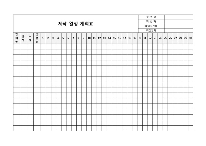 9,000원/월업체명과 품명, 수량, 납품처를 기록하여 제작의 일정을 통계하고 계획을 세울 때 사용되는 제작 일정 계획표 양식입니다. 품명, 품번, 수량, 납품처, 일자(1~30) 등의 항목으로 구성되어 있습니다.