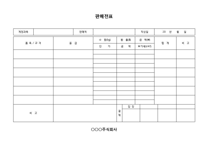 9,000원/월판매전표입니다. 계정과목, 판매처, 작성일, 품목/규격, 수량, 환율 등의 항목으로 구성되어 있습니다. 일반적인 판매전표로 사용할 수 있는 양식입니다.