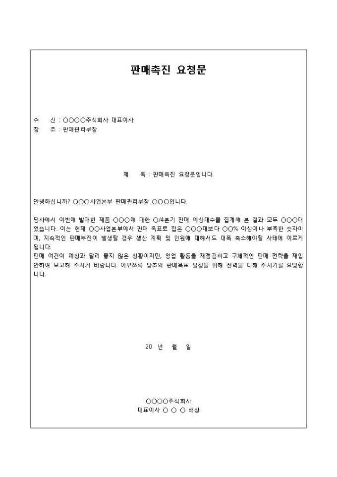 9,000원/월판매촉진 요청문 입니다. 신제품의 판매 효율이 저조에 대한 내용이 기록되었으며, 이에 따른 후속조치에 대한 내용이 포함된 양식입니다.