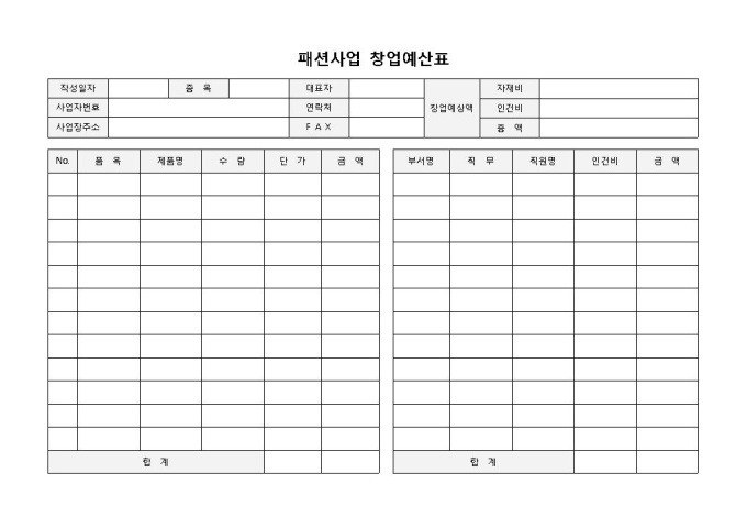 패선사업 창업예산표 입니다. 품목, 제품명, 수량, 단가, 직무, 직원명, 인건비, 금액 등으로 구성되었습니다. 자재비 및 인건비 소요액을 확인하고 그에 따른 창업예산액 계산에 효과적입니다.