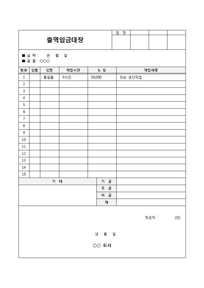 출역의 임금을 작업시간, 노임으로 통계하고 기록할 때 사용되는 출역 임금대장 양식입니다. 날짜, 공종, 번호, 성별, 성명, 작업시간, 노임, 작업사항 등의 항목으로 구성되어 있습니다.