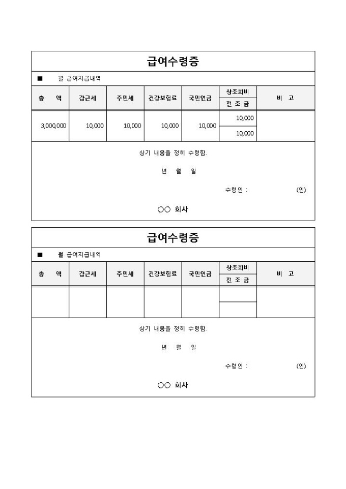 급여를 총 액, 갑근세, 주민세, 건강보험료 등의 여러 항목으로 세세하게 나누어 지급 및 수령할 때 사용되는 급여 수령증 양식입니다.