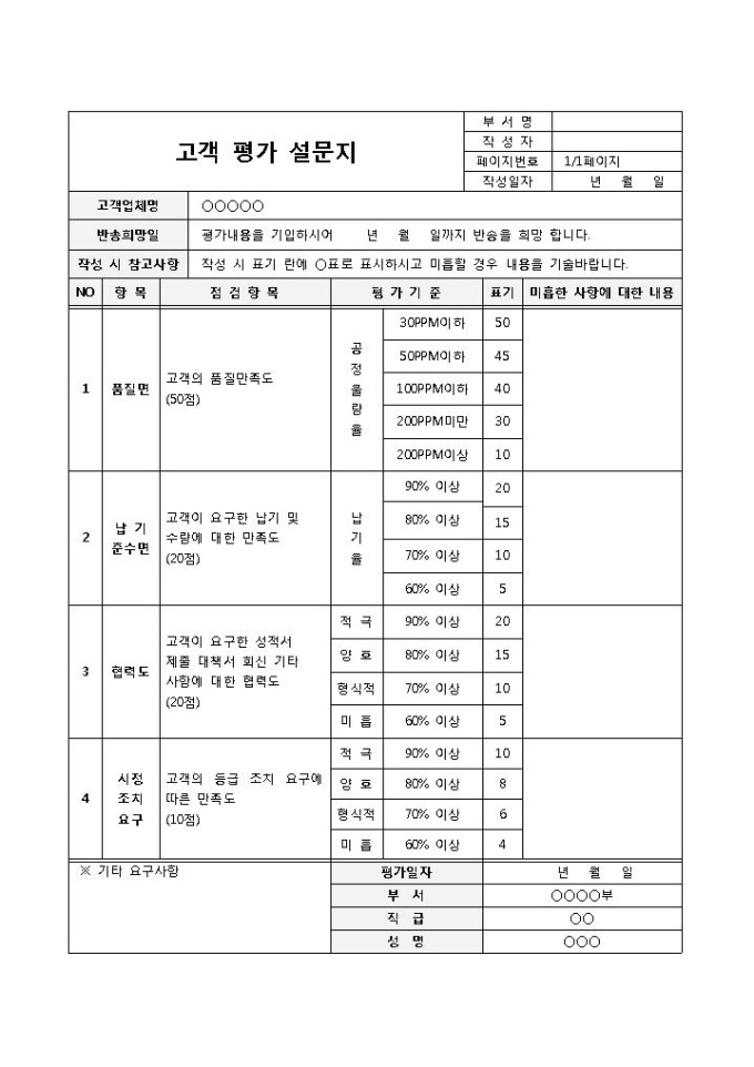 9,000원/월고객에 대한 평가를 위한 설문항목이 명시되어 있는 고객 평가 설문지 양식입니다. 고객업체명, 반송희망일, 항목, 점검항목, 평가기준, 미흡한 사항에 대한 내용 등의 항목으로 구성되어 있습니다.