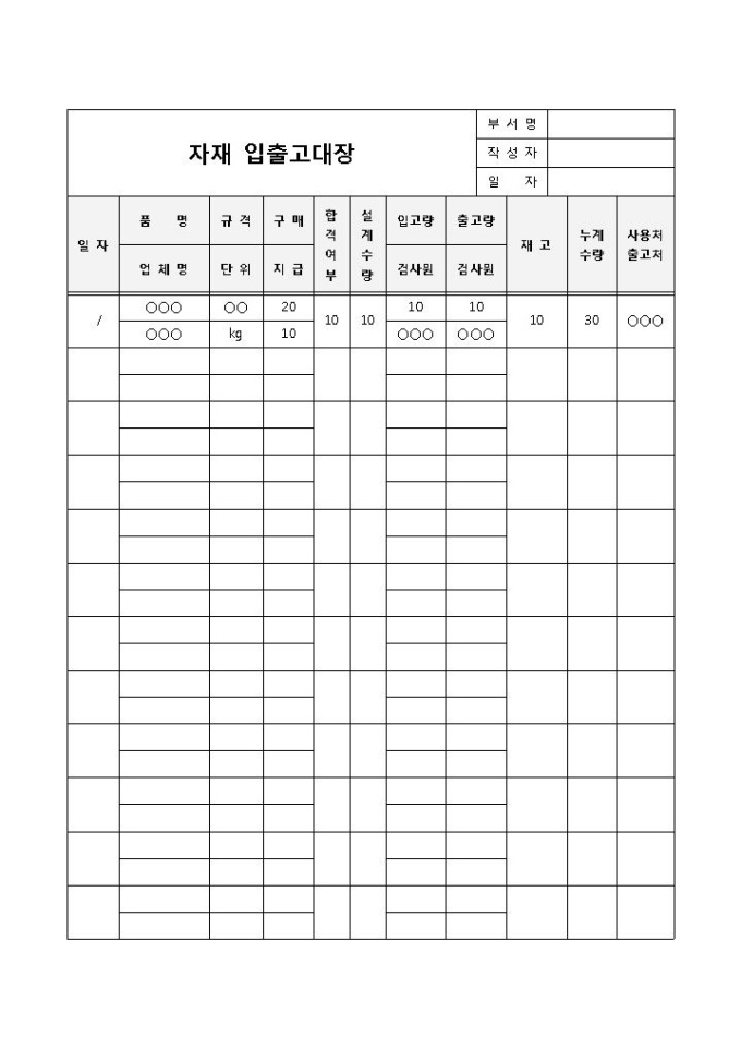 자재의 입, 출고의 관리 및 기록을 위해서 사용되는 자재 입출고 대장 양식입니다. 일자, 품명, 업체명, 규격, 구매, 합격여부, 설계수량, 입고량, 출고량, 재고, 누계 등의 항목으로 구성되어 있습니다.