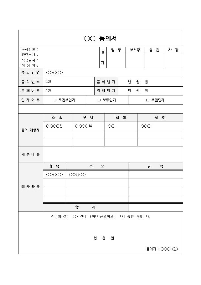 9,000원/월어떠한 일의 집행을 시행하기에 앞서 결재권자에게 특정한 사안을 승인해 줄 것을 요청할 때 기안하는 품의서 기안 양식입니다. 품의건명, 인가여부, 품의대상자, 세부내용, 예산산출 등의 항목으로 구성되어 있습니다.