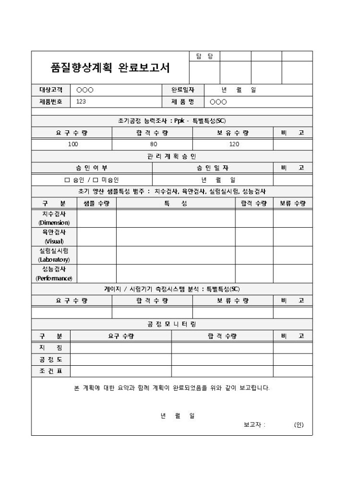 9,000원/월품질 향상 계획에 대한 업무를 마무리하였음을 보고할 때 사용되는 품질향상계획 완료보고서 양식입니다. 대상고객, 완료일자, 조기공정 능력조사, 관리계획승인, 초기 양산 샘플특성 범주, 공정 모니터링 등의 항목으로 구성되어 있습니다.